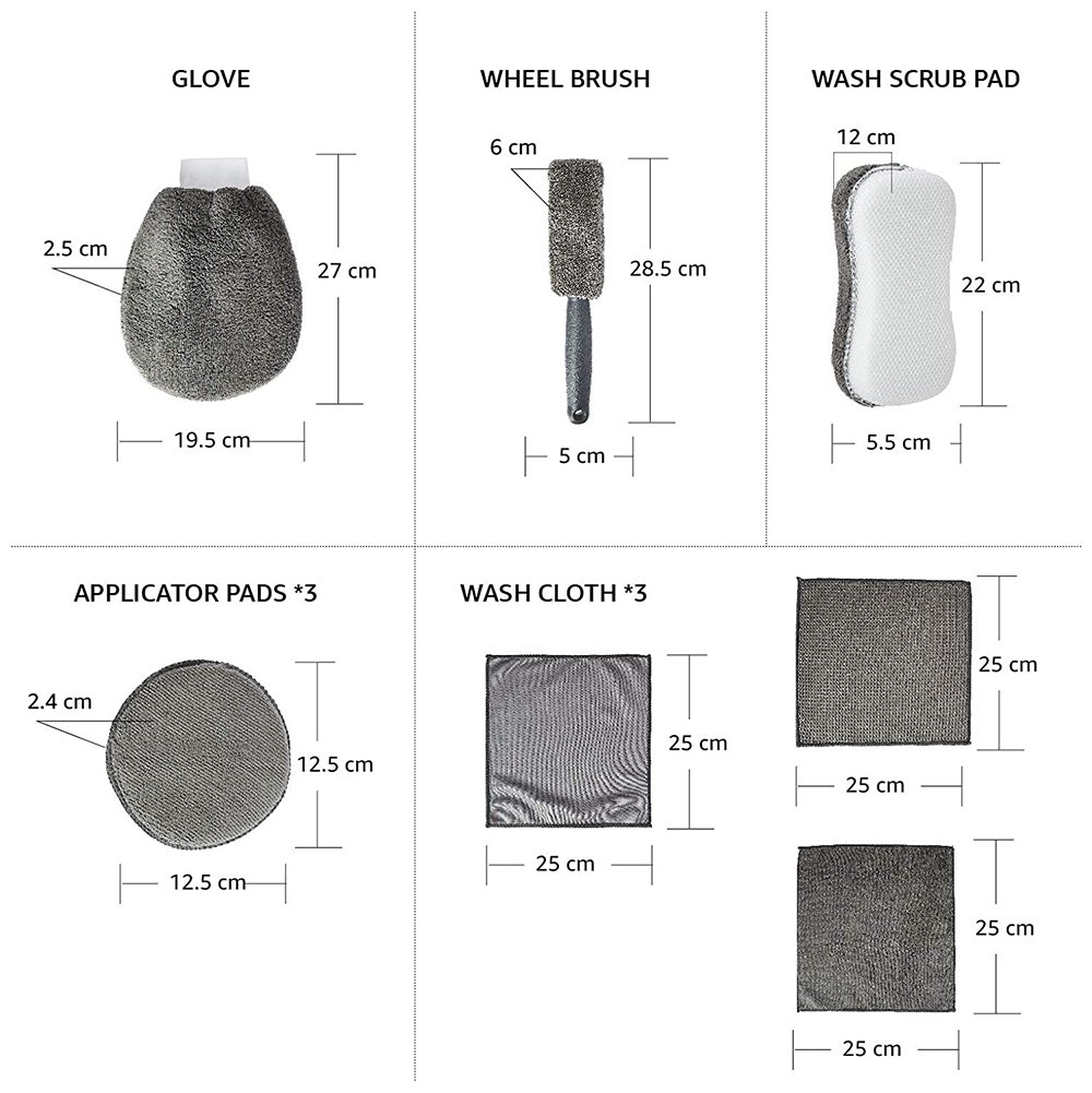 - Products include: 3 *?Microfiber Towels +?3* Polish Applicator Pads +?1* Wash Sponge +?1* Wash Glove +?1* Wheel Brush
