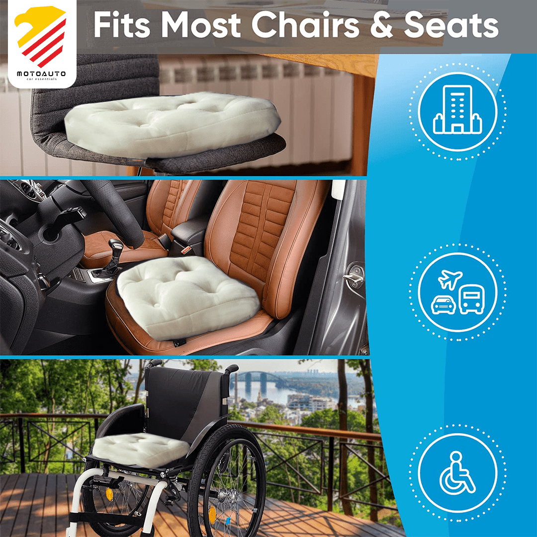 Car seat cushions come in various materials and designs, including foam, memory foam, gel and air-filled cushions. Some cushions are contoured to fit naturally with the curves of the body while others may feature flat areas with raised areas for additional support.